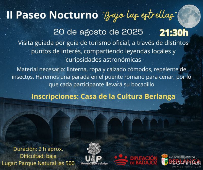 El próximo 20 de agosto de 2025, Berlanga celebrará su II Paseo Nocturno “Bajo las estrellas”, una experiencia que combina naturaleza, historia y astronomía. La cita comenzará a las 21:30 horas y estará guiada por un guía de turismo oficial, que conducirá a los participantes a través de distintos puntos de interés mientras comparte leyendas locales y curiosidades astronómicas.