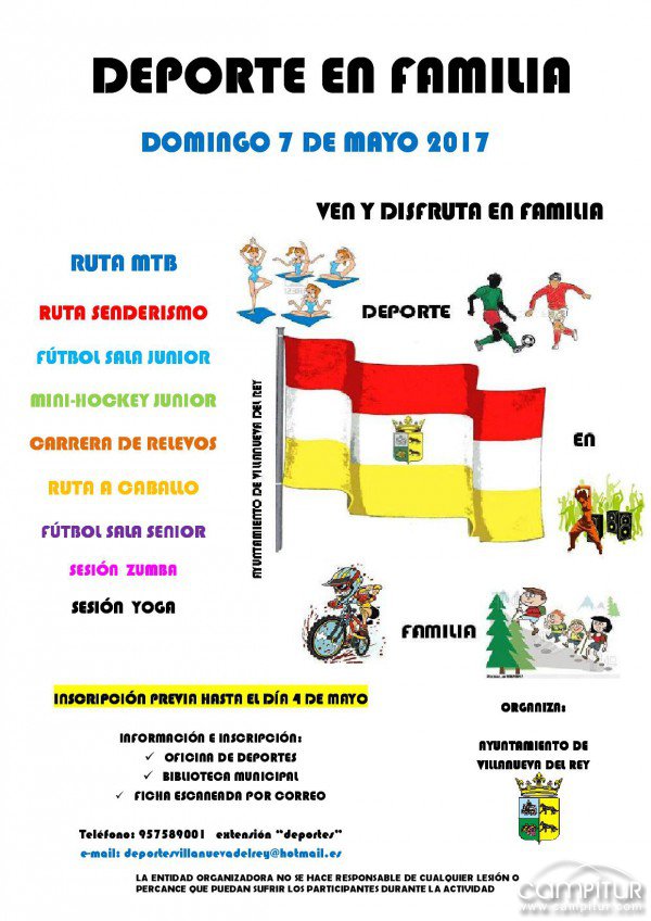 El domingo, 7 de mayo, Villanueva del Rey acoge por tercer año consecutivo la jornada “Deporte en Familia”, en horario de 08:30 a 13:30 horas.